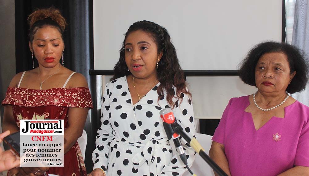 « Nous voyons que la représentation  politique des femmes reste faible par rapport à leur nombre. Cette situation pose le problème de la responsabilité d’un grand nombre de parties prenantes : les femmes elles-mêmes, les partis politiques, la société civile, les médias, les autorités étatique, sur l’égal accès des femmes aux instances de prise de décision ». De ce fait, le CNFM interpelle et lance un appel solennel pour nommer  des femmes aux cinq postes non encore pourvus de gouverneur dans les régions Amoron’i Mania, Betsiboka, Bongolava, Ihorombe et Melaky ; proposer des femmes aux différents postes d’ambassadrices encore vacants ; favoriser les candidatures des femmes au sein des partis  politiques dans toute l’élection à venir ; nommer des femmes sénatrices.