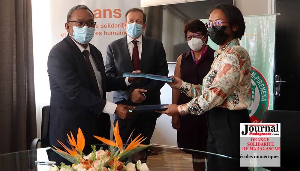 Le programme « écoles numériques » est mis en œuvre par l’Orange Solidarité de Madagascar afin de faciliter l’imprégnation du programme éducatif en ajoutant des contenus numériques dans les classes primaires et secondaires. Le programme utilise une méthode ludique et efficace par le numérique, afin de permettre aux élèves d’enregistrer de meilleurs résultats. La Ministre de l’Education Nationale, Marie Michelle Sahondrarimalala, et le Président de l’association, Benja Arson, ont procédé ce mardi 23 novembre à la signature de l’avenant du Protocole d’accord signé le 11 Juin 2014, portant sur ce le programme « Education numérique ». 30 nouveaux établissements scolaires seront dotés chacun d’un kit numérique pour l’année scolaire 2021-2022. Chaque Kit comprend 1 laptop, 25 tablettes, 25 casques, 2 serveurs Raspberry, 1 vidéoprojecteur avec 1 écran, des Powerbank, des multiprises ainsi que des contenus enrichis déjà embarqués dans les serveurs. Orange Madagascar accompagne les écoles bénéficiaires dans la formation des enseignants et des élèves pour l’utilisation des kits, grâce aux salariés bénévoles de l’entreprise.