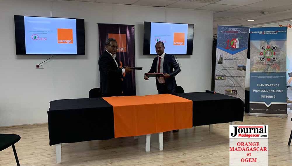Orange Madagascar va soutenir l’Ordre des géomètres experts de Madagascar (OGEM), notamment en matière de connectivité, qui améliorera ses capacités de communication, et accompagnera l’OGEM dans sa transformation numérique en soutenant le développement de la plateforme numérique e-Araka. Cet engagement s’inscrit dans le cadre de partenariat entre Orange Madagascar et OGEM. La cérémonie de signature protocole s’est tenue le 02 Août 2022, en présence du Président de l’Ordre des géomètres experts de Madagascar, Nasoavina Rakotomalala, et du DGA d’Orange Madagascar, Benja Arson. Ce partenariat vise à accompagner l’OGEM dans sa transformation numérique. A travers cet accord, Orange Madagascar assume pleinement sa responsabilité afin de nourrir le lien social et d’apporter au plus grand nombre le bénéfice des nouvelles technologies. Orange Madagascar apporte également son appui à l’OGEM dans la célébration de ses 10 ans, à travers la fourniture d’une connexion internet haut débit lors du « Salon de la topographie et du foncier » qui se tiendra les 3, 4 et 5 août 2022 au Stade Barea à Mahamasina. Le numérique s’impose de plus en plus comme un véritable levier pour l’inclusion. Depuis plusieurs années, Orange a ainsi développé plusieurs produits et services afin de faciliter le quotidien des professionnels de différents secteurs d’activités. Par ailleurs, la responsabilité sociétale de l’entreprise (RSE) est un concept dans lequel les entreprises intègrent les préoccupations sociales, environnementales et économiques dans leurs activités et dans leurs interactions avec leurs parties prenantes. Orange Madagascar, a totalement intégré cette donne dans son fonctionnement tant en interne que vis-à-vis des autres parties prenantes.