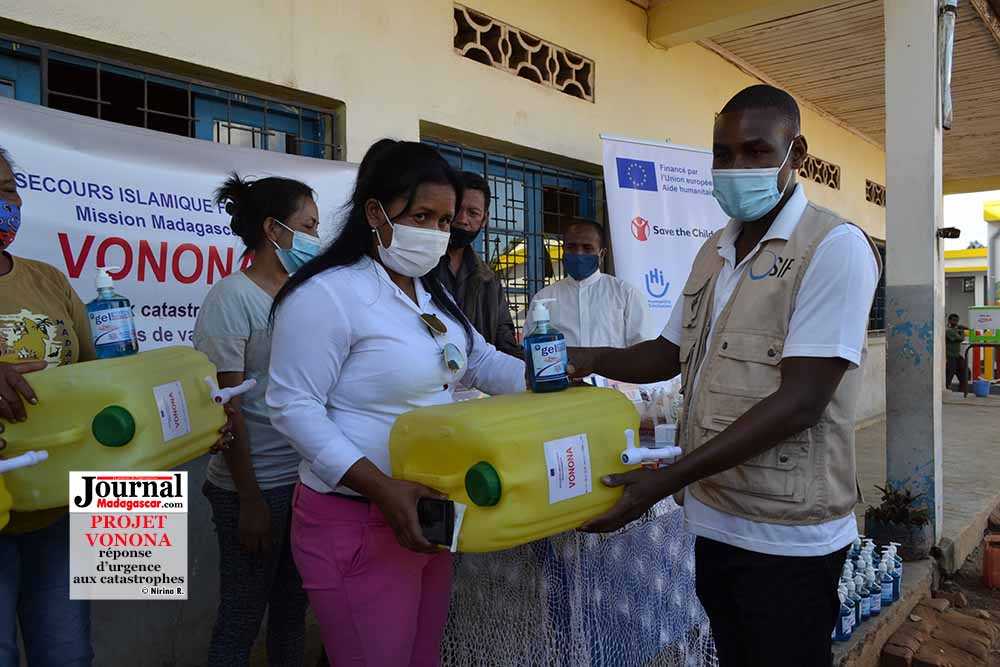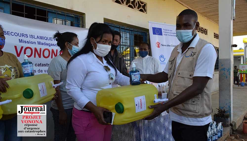 L’appui aux établissements scolaires pour la préparation et la réponse d’urgence aux catastrophes est une des composantes clés du projet Vonona. Ce projet est financé par l’Union Européenne et mis en œuvre par un consortium de six ONG à Madagascar, notamment Save The Children, Secours Islamique France (SIF) , Medair, croix rouge, Humanité, Action Contre la Faim. Suite au passage du cyclone Ana et Batsirai, le projet a offert des kits scolaires et kits Covid-19 aux cinq (05) écoles primaires publiques (EPP) réparties dans les quartiers de la ville d’Antananarivo, victimes d’inondation après le passage de ces deux cyclones. Il s’agit de l’EPP Ankazomanga Sud, EPP Antohomadinika III G Hangar, EPP Ambodihady, EPP Ankeniheny et EPP Antanimena. Les kits scolaires sont composés des cahiers, règles, équerres, rapporteurs, compas, stylos, crayons, taille crayon, gomme, craies, éponge. Le projet octroie également des kits jeux (ballon de foot, filet, jeux de société et livres de conte) et des kits pédagogiques (manuel mathématique T1 à T5, manuel Malagasy T1 à T5, cahiers et stylos pour les enseignants, boites de craies blanches et éponges). En ce qui concerne les kits de protection contre le covid-19, ils sont composés de gels hydro-alcooliques, lave main, savons, masques, thermo flash. Ces dons ont été remis ce jeudi 10 février 2022 au sein de l’EPP Antanimena II.